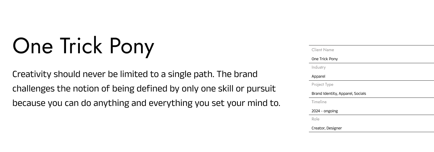 One Trick Pony was built on the idea that creativity should never be limited to a single path. The brand challenges the notion of being defined by only one skill or pursuit because you can do anything and everything you set your mind to. Through bold apparel design, strategic branding, and thoughtful storytelling across digital and physical spaces, One Trick Pony embodies versatility and self-expression. It’s more than clothing it’s a reminder to live beyond labels. Don’t be a one trick pony. Just wear it.